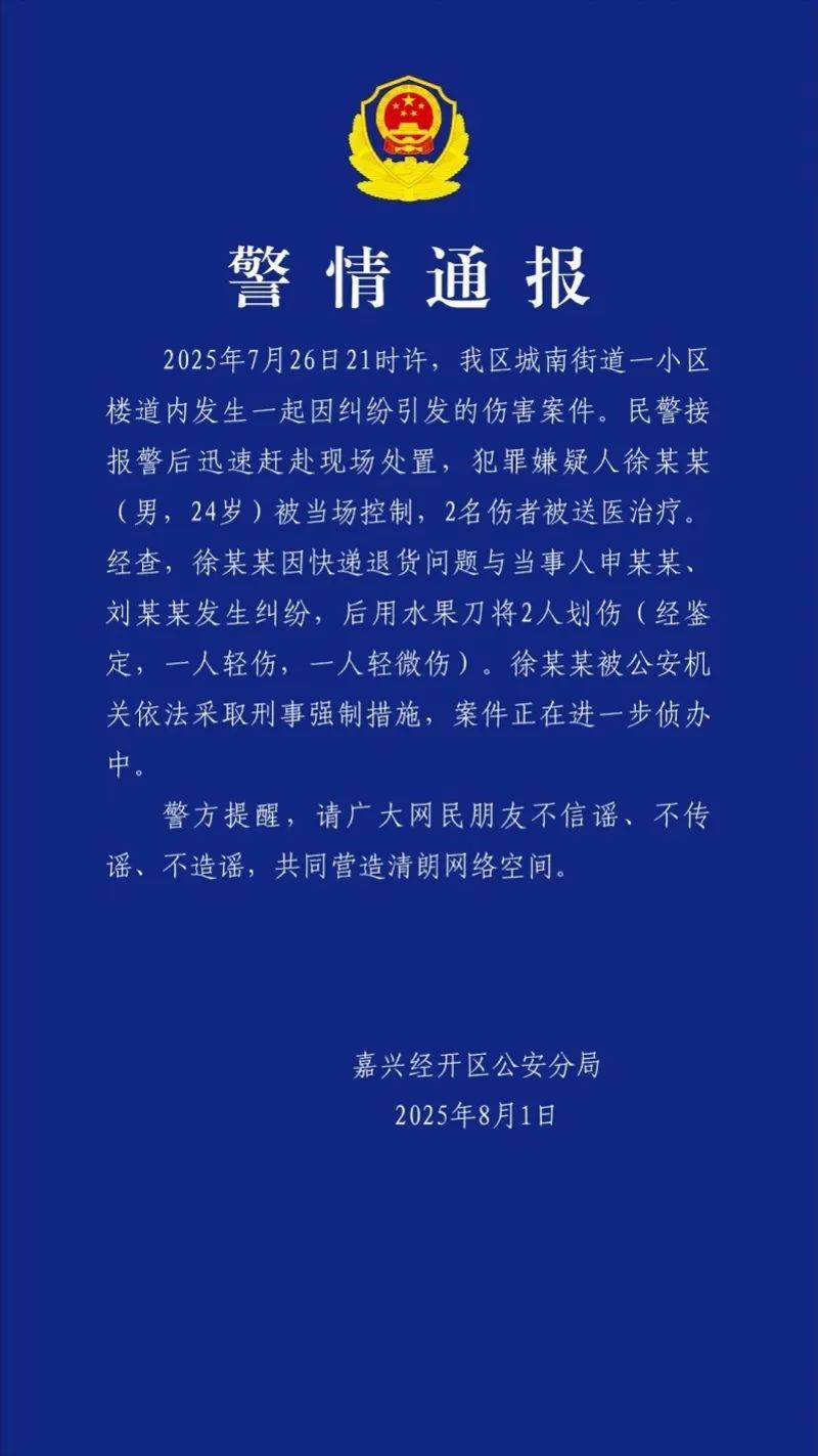 8月1日晚,嘉兴市公安局经济技术开发区分局发布警情通报,7月26日21时许,城南街道一小区楼道内发生一起因纠纷引发的伤害案件。民警接报警后迅速赶赴现场处置,犯罪嫌疑人徐某某(男,24岁)被当场控制,2名伤者被送医治疗。